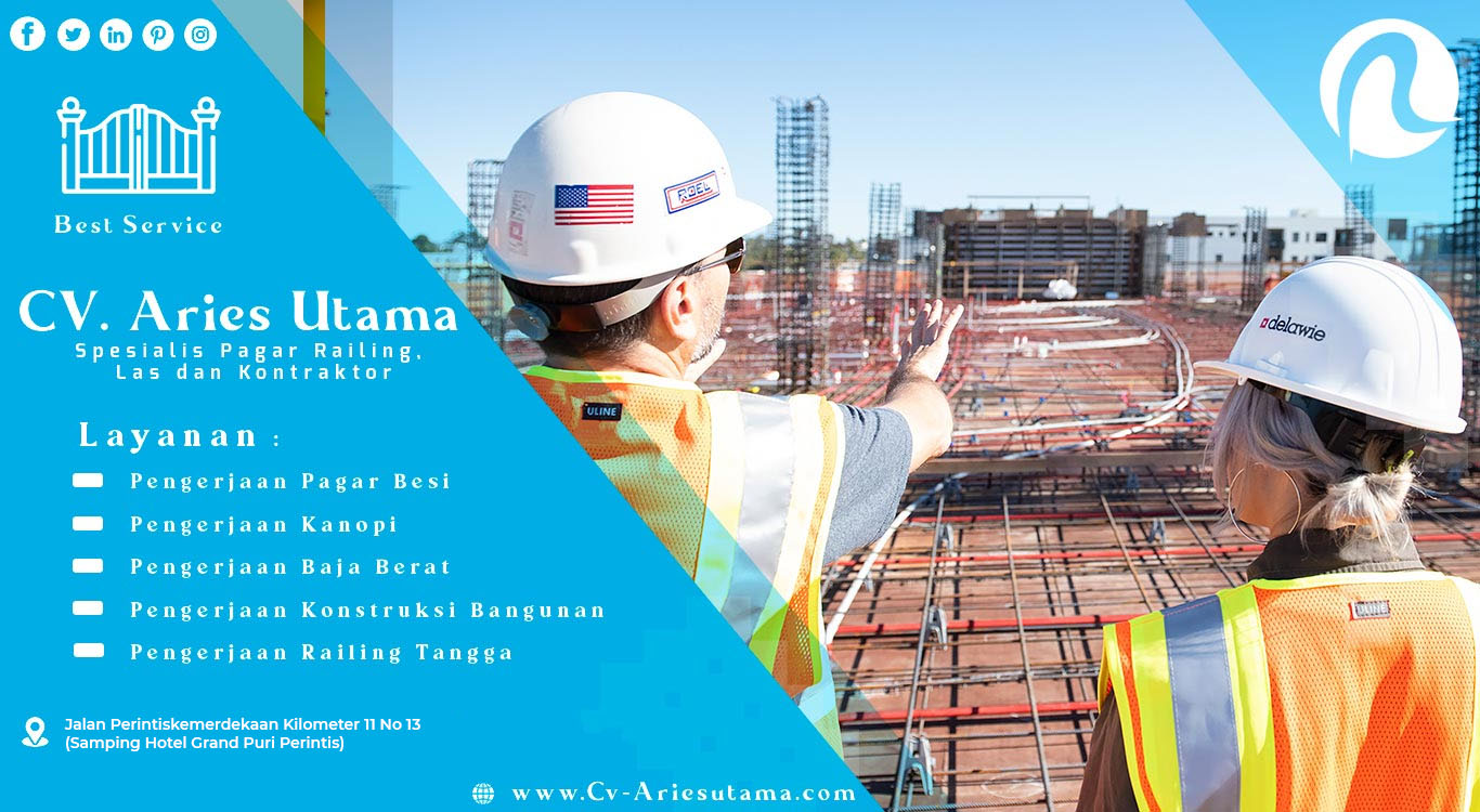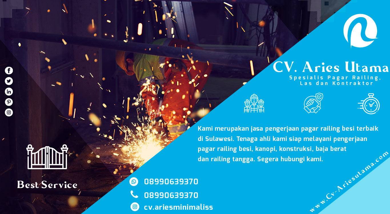 CV. Aries Utama merupakan jasa pengerjaan railing pagar besi terpercaya dan berpengalaman di Sulawesi. Kami menyediakan berbagai layanan seperti pengerjaan pagar railing besi dengan tempa kembang coralmunium, pengerjaan kanopi, konstruksi dan lain-lain. Kami selalu melayani konsumen dengan maksimal dan memuaskan. Pengerjaan kami menggunakan alat-alat modern sehingga hasil yang tercipta sangat memuaskan. Bagi anda yang sedang mencari spesialis pagar railing besi, silahkan segera hubungi CV. Aries Utama.